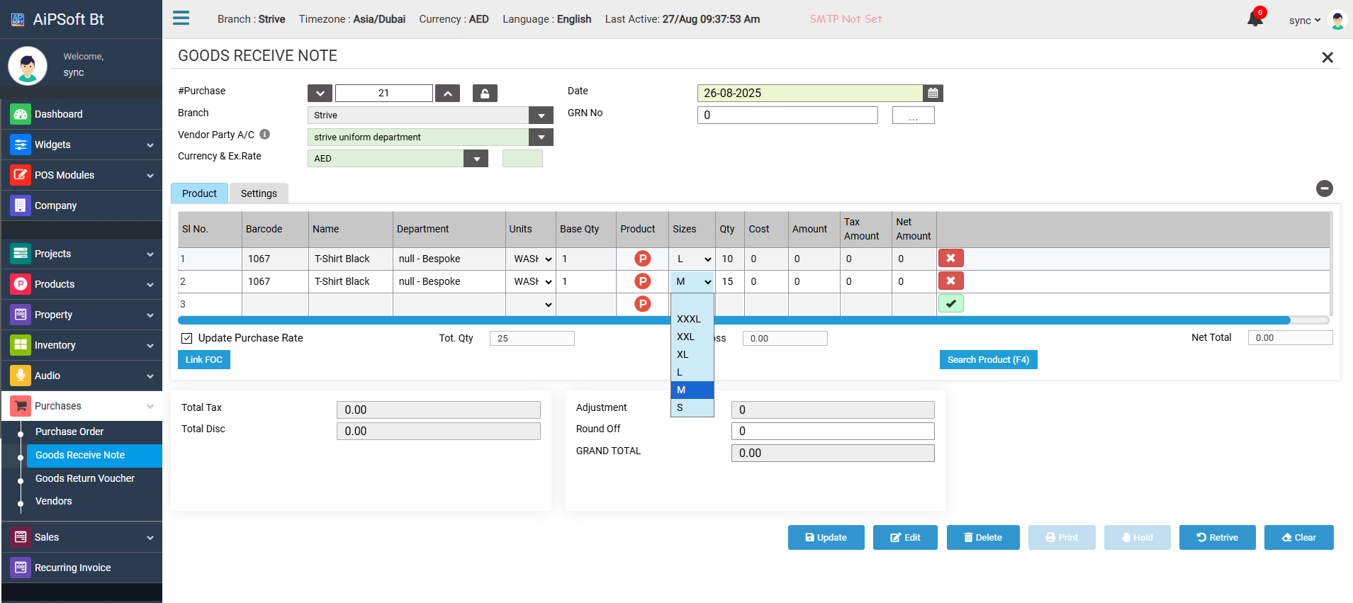 Once uniforms are ordered, they are received from the supplier/higher department/purchasing team. This step ensures inventory correctness.